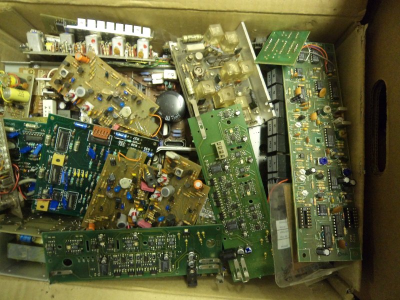 Kasse med diverse print med komponenter til brug for diverse og samt til loddeøvelser