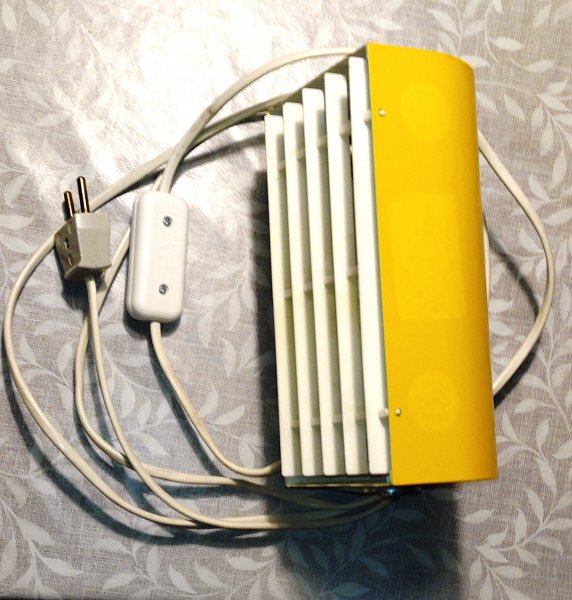 Velholdt eksemplar i gul af denne klassiske sengelampe fra 1970'erne. Kun ubetydelige brugsspor. Der sad 3 klistermærker på forkanten. De er fjernet med rensebensin, men der er svage skjolder efter dem (anes svagt på de to første billeder). Disse vil fortone sig ila. af et par måneder.